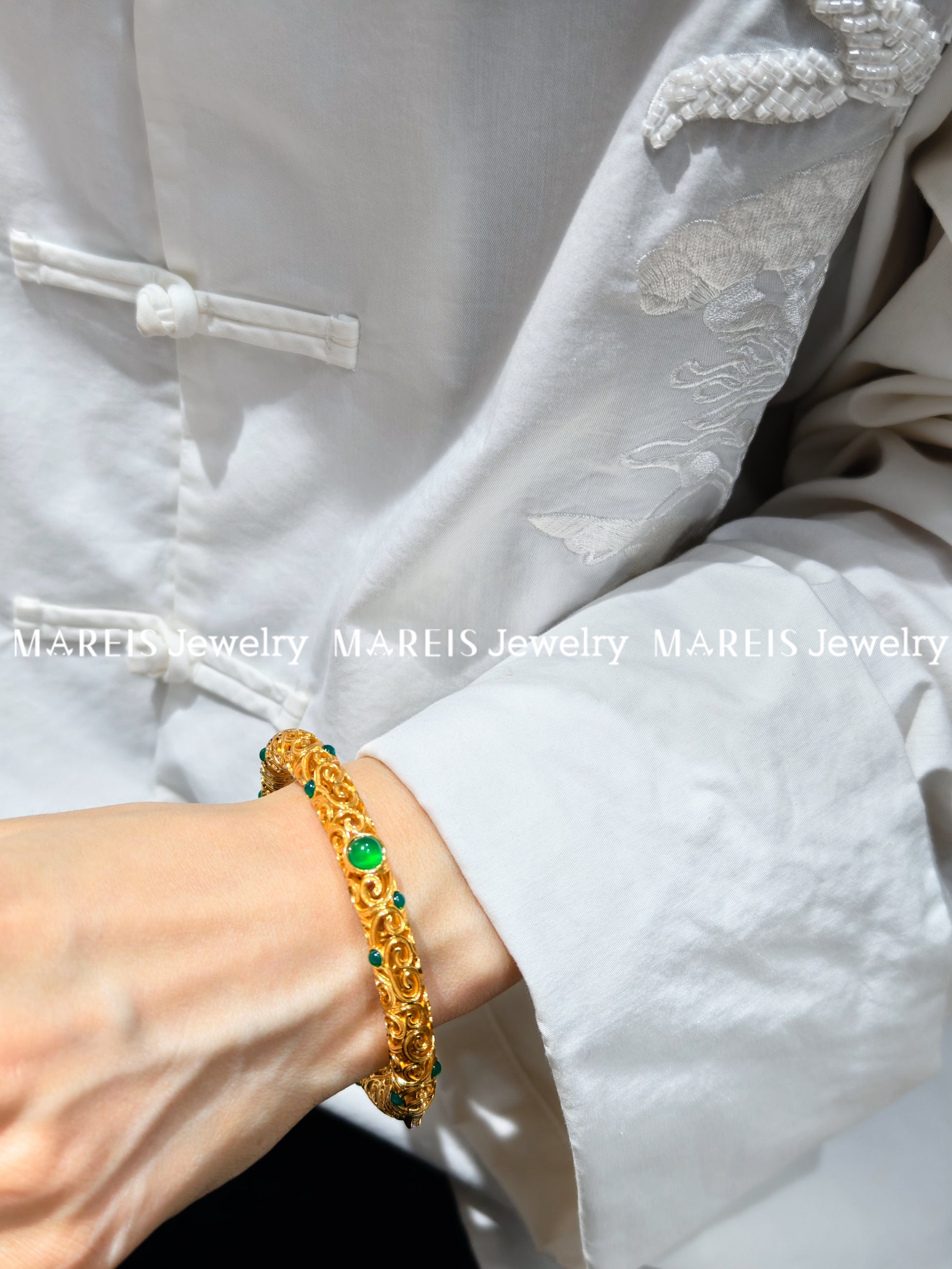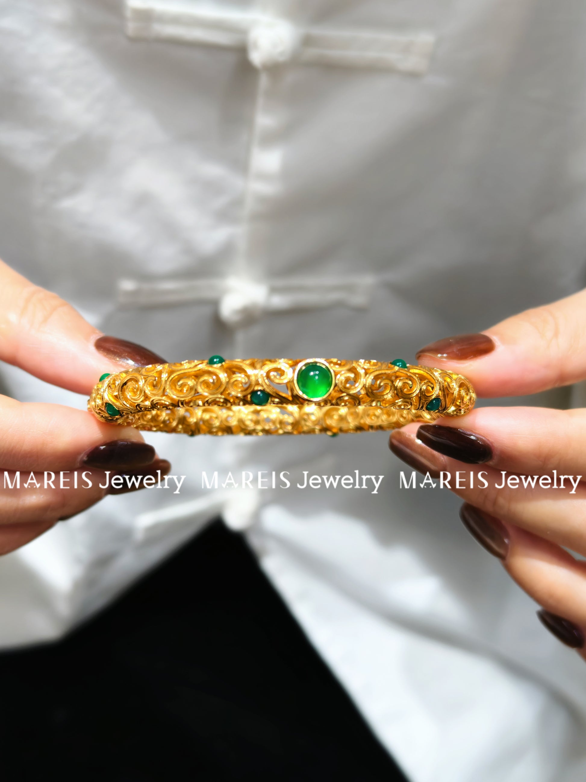 A masterpiece of meticulous artistry, this bangle draws inspiration from the legendary Jade Road caravans, where artisans traded not just gems, but stories woven into metal. The filigree lattice, handcrafted using a 17th-century technique of coiling and soldering threads of gold, mimics the veins of a lotus leaf—delicate yet unbreakable. Nestled within its intricate patterns lies a band of vibrant green enamel, symbolizing the eternal cycle of growth and renewal. Legend tells of a Ming Dynasty craftswoman who forged such a bangle to honor her daughter’s resilience, embedding the green hue as a vow: “True strength lies in bending, not breaking.” Wear it as a testament to grace under pressure, where fragility and fortitude dance in harmony.