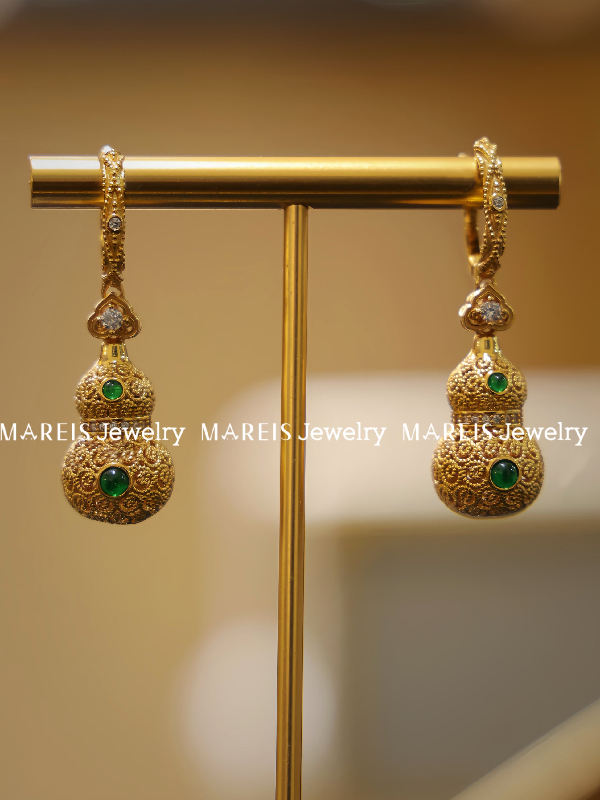 Inspired by the legend of a Qing Dynasty gardener who grew gourds entwined with jade vines, these earrings blend the Hulu’s symbolism of longevity with the lush vitality of emeralds. The gourd’s silhouette, crafted in intricate filigree, mimics the delicate lattice of a climbing vine, each hand-coiled thread of gold symbolizing life’s interconnected journeys. At the Hulu’s base rests a bezel-set emerald cabochon, its verdant hue echoing the gardener’s belief that “prosperity blooms where patience meets the earth.” A modern heirloom for those who wear their resilience with quiet elegance, these earrings honor both the strength of roots and the courage to reach upward.