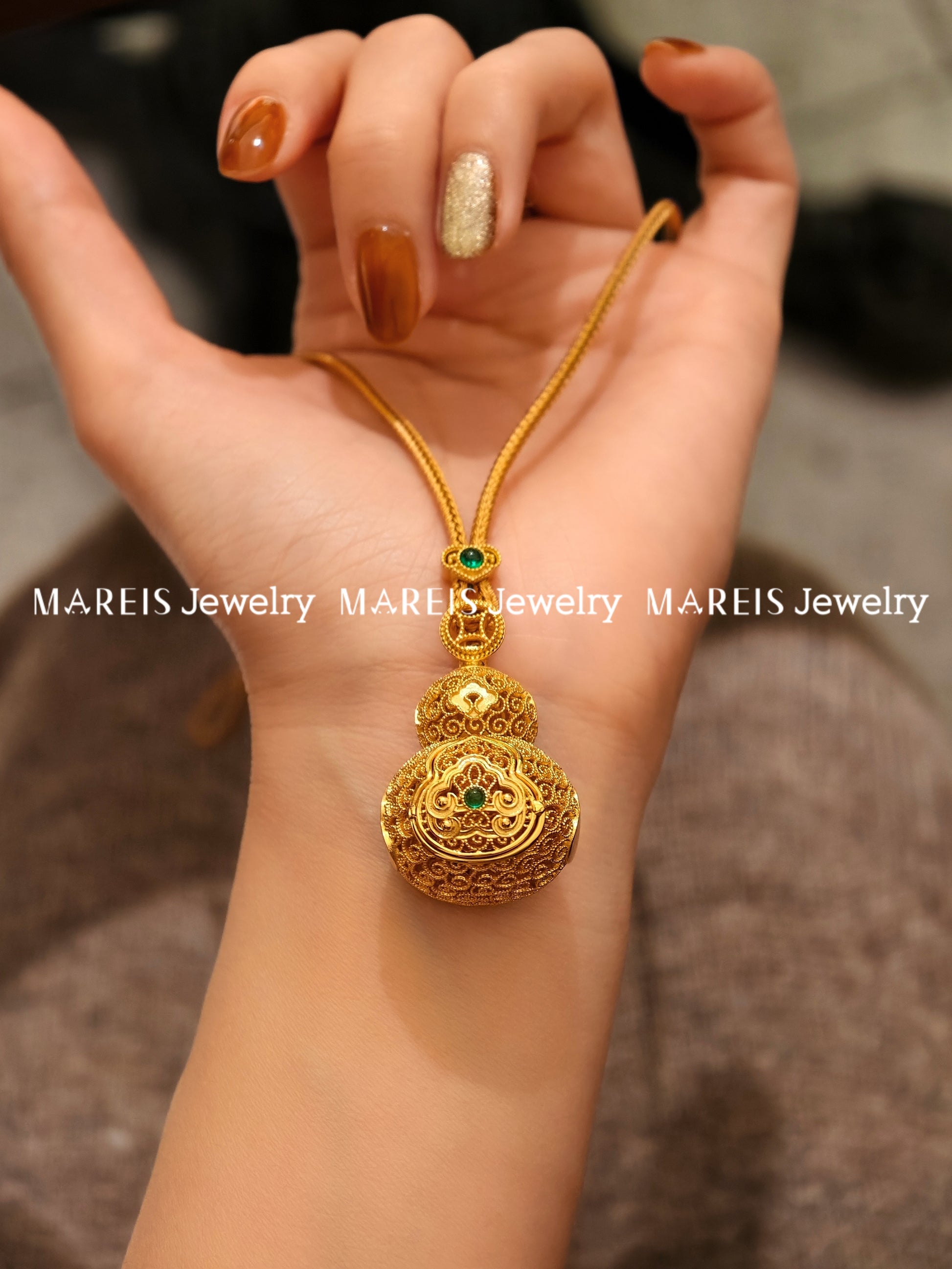 A masterpiece of patience and precision, this necklace marries the sacred symbolism of the Hulu (gourd) with the intricate artistry of traditional filigree. Legend tells of a master metalsmith in ancient Luoyang who spent a lifetime perfecting the "dragon’s breath" technique—twisting and soldering gold threads thinner than silk to create lace-like metalwork. Here, the Hulu’s curved form is adorned with swirling filigree patterns, each hand-set coil symbolizing the interconnectedness of life’s blessings and challenges. At its center rests a miniature Buddha, inlaid with a micro-mosaic of oxidized silver, a nod to the quiet wisdom that dwells within chaos. The Hulu, a vessel of health and protection, becomes a canvas for devotion to craft—a testament to the belief that beauty is born when hands honor tradition and heart alike.