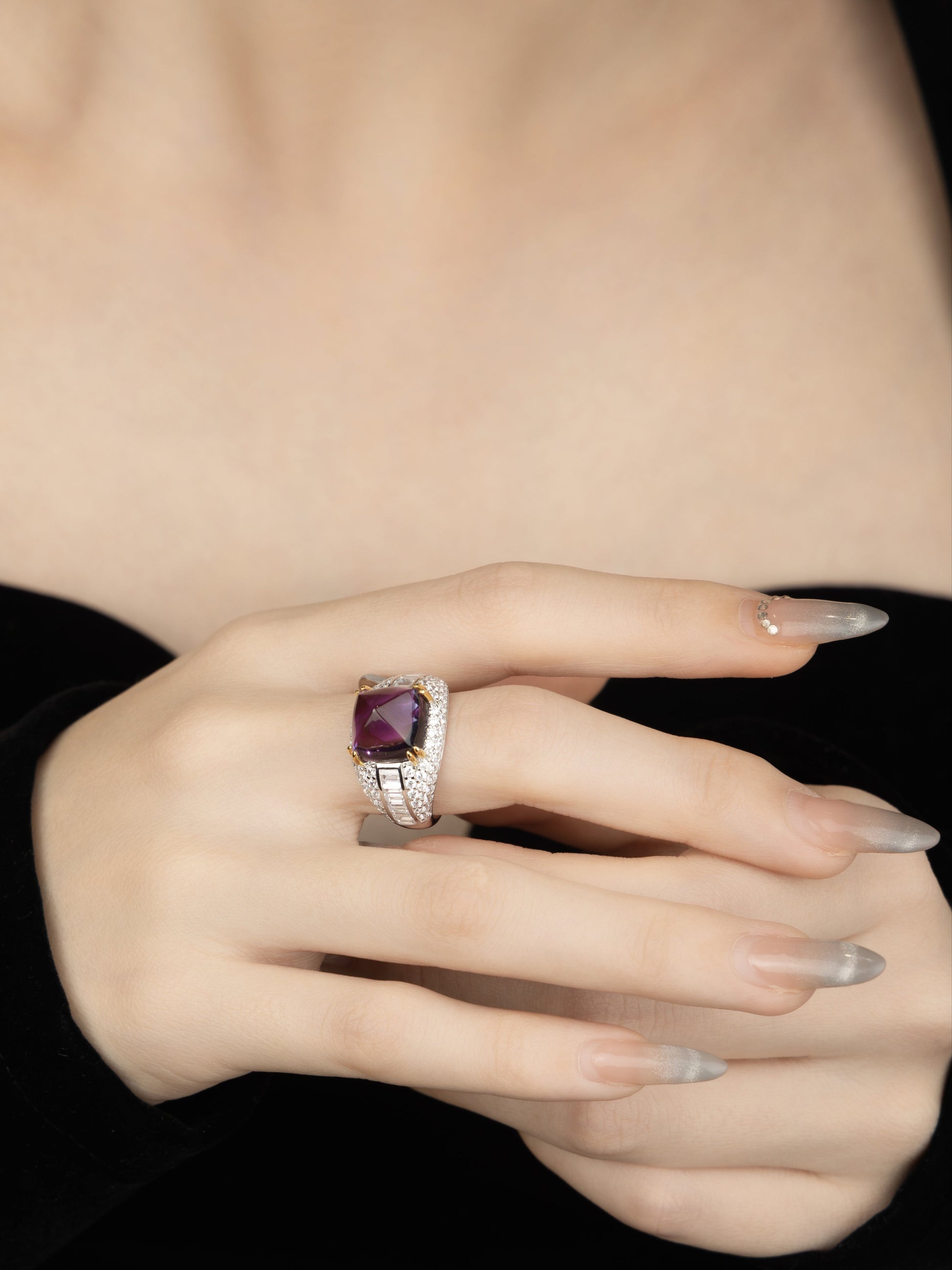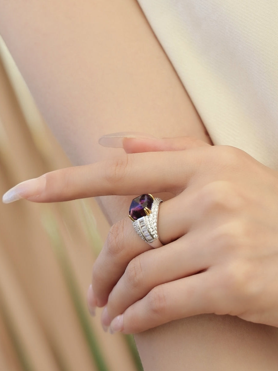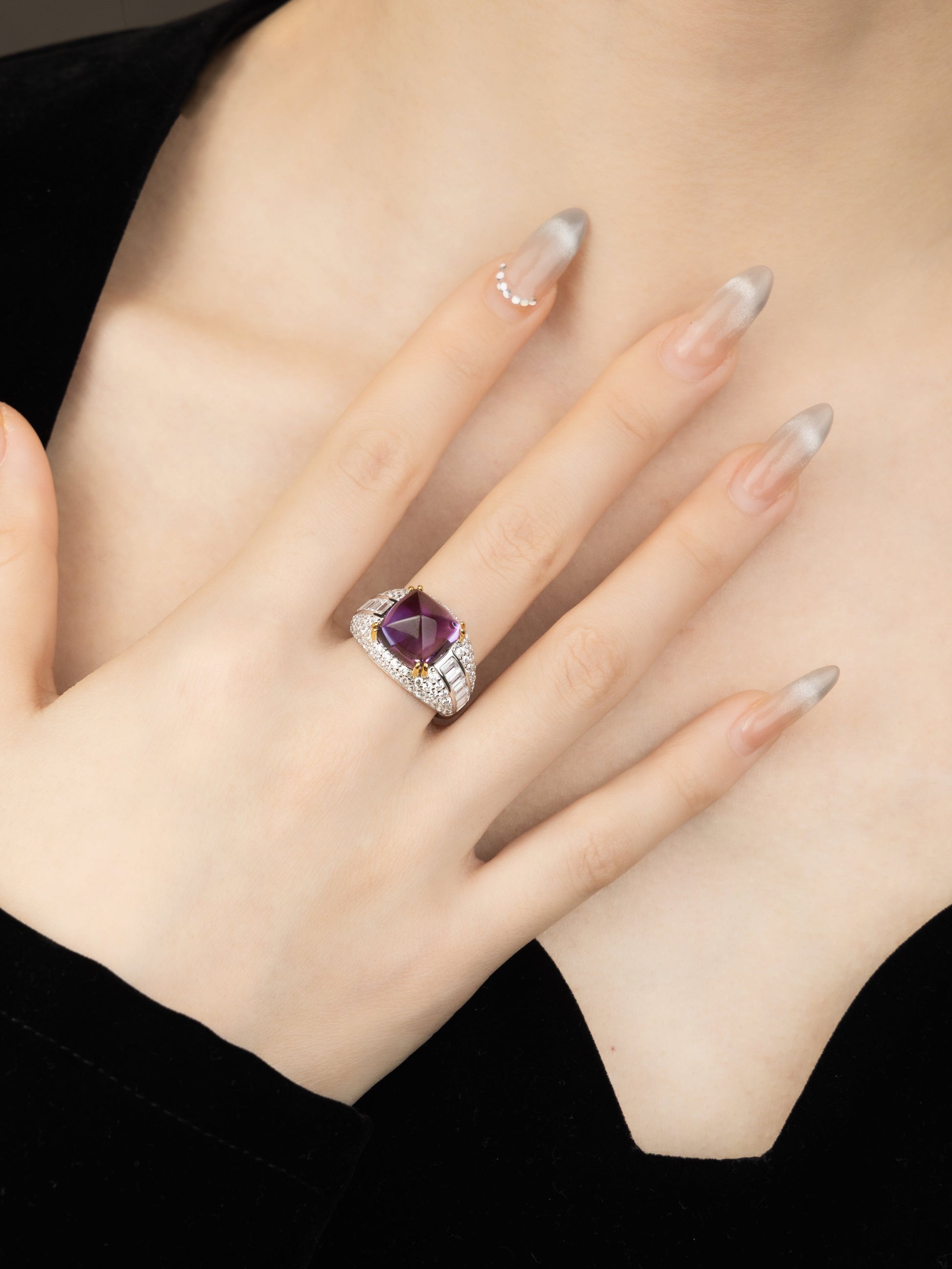 The Aristocrat, a ring that exudes sophistication and grace. Featuring a regal natural amethyst, its deep purple hue symbolizes wisdom, clarity, and a connection to the divine. Known as the ‘stone of serenity,’ amethyst is believed to bring calm, balance, and a touch of royal charm to its wearer. Set in polished sterling silver (S925), this ring is a masterpiece of understated luxury, designed for those who appreciate the finer things in life.