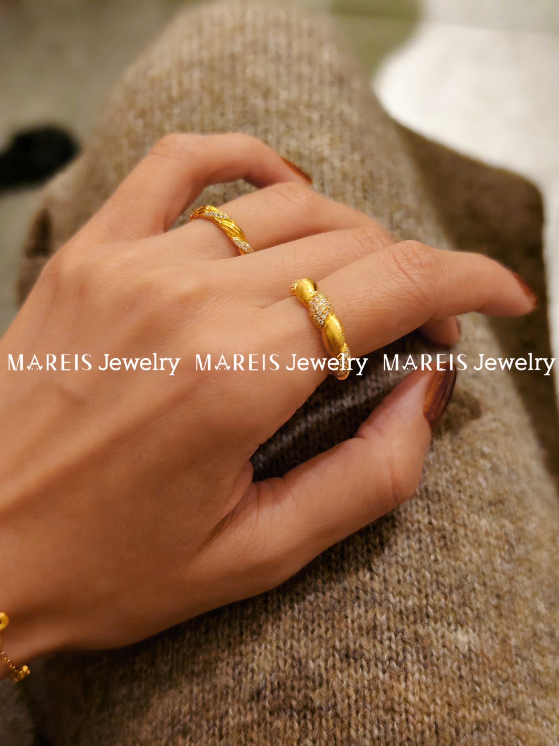 A testament to the beauty of duality, this ring fuses the Italian segrainato technique—a symphony of precise, hairline engravings—with the eternal metaphor of the twist, a symbol of unity and inseparable bonds. Legend tells of a Florentine goldsmith who crafted this design for two lovers separated by war, weaving their initials into a helix-like band so that “even distance could not unravel their threads.” The spiral’s fluid curve, plated in warm 18K gold, embodies the dance of opposites: strength and softness, independence and connection. A ring for those who believe love, like metal, is shaped not by force, but by patient artistry.